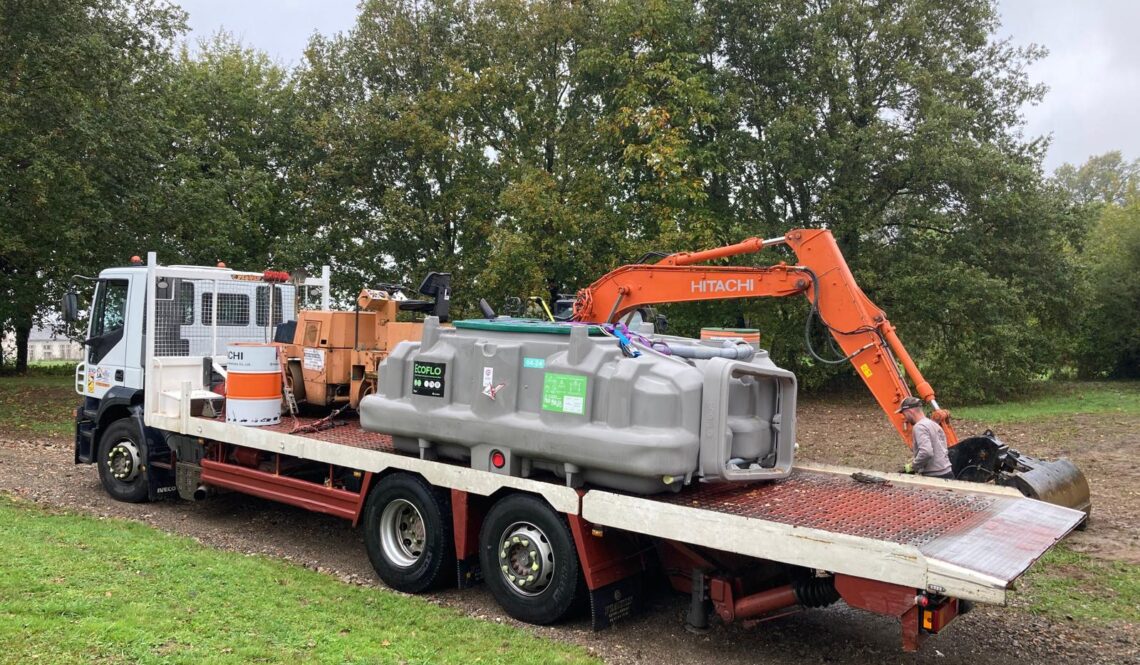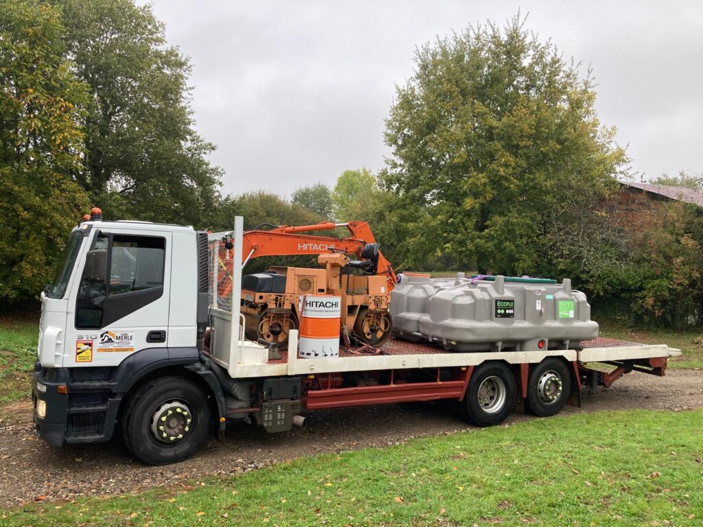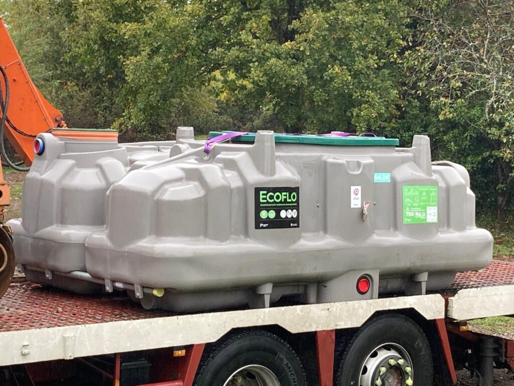Vandaag komen we wat moeilijk op gang. Het regent pijpenstelen! In bed liggen we heerlijk warm en met het getik van de regen draaien we ons nog eens om. Aan het eind van de ochtend vinden we dat we toch maar aan de slag moeten met wat we gepland hadden voor vandaag: het isoleren van het volgende deel op de bovenverdieping. Radio mee en aan de slag. Na een half uurtje hoor en zie ik een vrachtwagen achteruit het terrein oprijden. Het is Simon van Eurl Merle, hij komt onze sceptic tank (EcoFlo 6) brengen. Eindelijk is de tank hier.