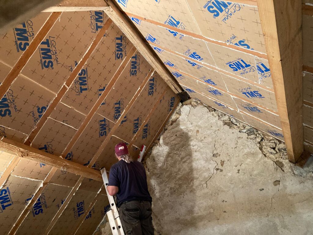 Terwijl buiten hard wordt gewerkt sluiten wij onszelf boven op. We isoleren weer een deel van het dak : van de muur tot aan het A-frame. We vullen tussen de sporen; 14 vakken. En daar doen we precies 1 dag over. Nog één vak te gaan. Dat doen we volgende week, dat houdt het leuk. Dan blijft er daarna nog het laatste deel over; het deel boven het bakkershuisje. Maar daar ligt nog geen vloer in dus dat is voor een andere keer.