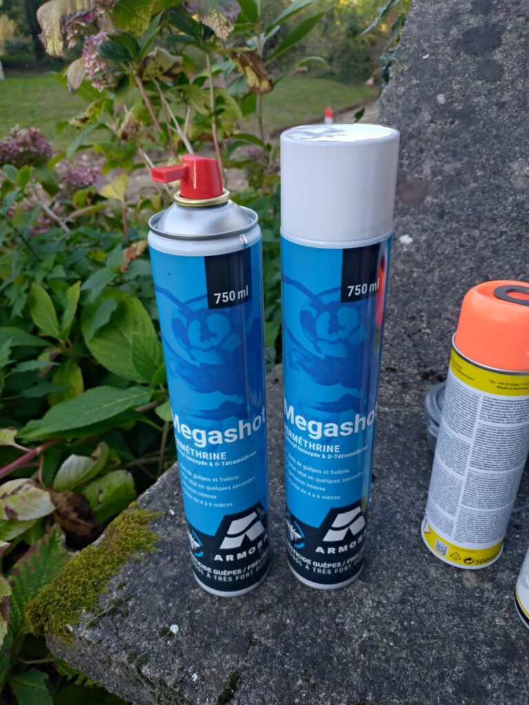 Vervolgens besluit ik ook een bericht te sturen aan Andy & Lisa, misschien weten zij iets. Andy komt in de middag kijken en zal ons vertellen wat hij weet. Zo fijn! Wanneer hij in de middag arriveert laten we de nest zien en vervolgens rijden Andy & ik naar de lokale bouwmarkt op zoek naar gif. En die vinden we! Bij het vallen van de avond kleed ik mezelf goed aan; handschoenen, muts, bril en alles dichtgetaped met ductape. Met een spuitbus en een bus purschuim trek ik ten strijde…. Arjan kijkt op veilige afstand toe. Hij is zwaar allergisch dus blijft uit de buurt. Ik wacht totdat een grote groep hoornaars weer terug in de nest is en ga ervoor! Spuiten maar. Wat een goed spul is dit, ze vallen letterlijk binnen een aantal seconden dood neer. Ik spuit 2 bussen leeg en spuit het nest vol met purschuim. Klusje geklaard en het viel gelukkig mee! Morgen de burgemeester maar even laten weten dat het gelukt is en haar bedanken voor haar hulp.